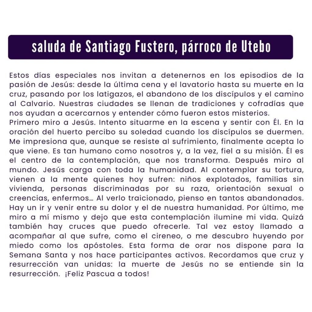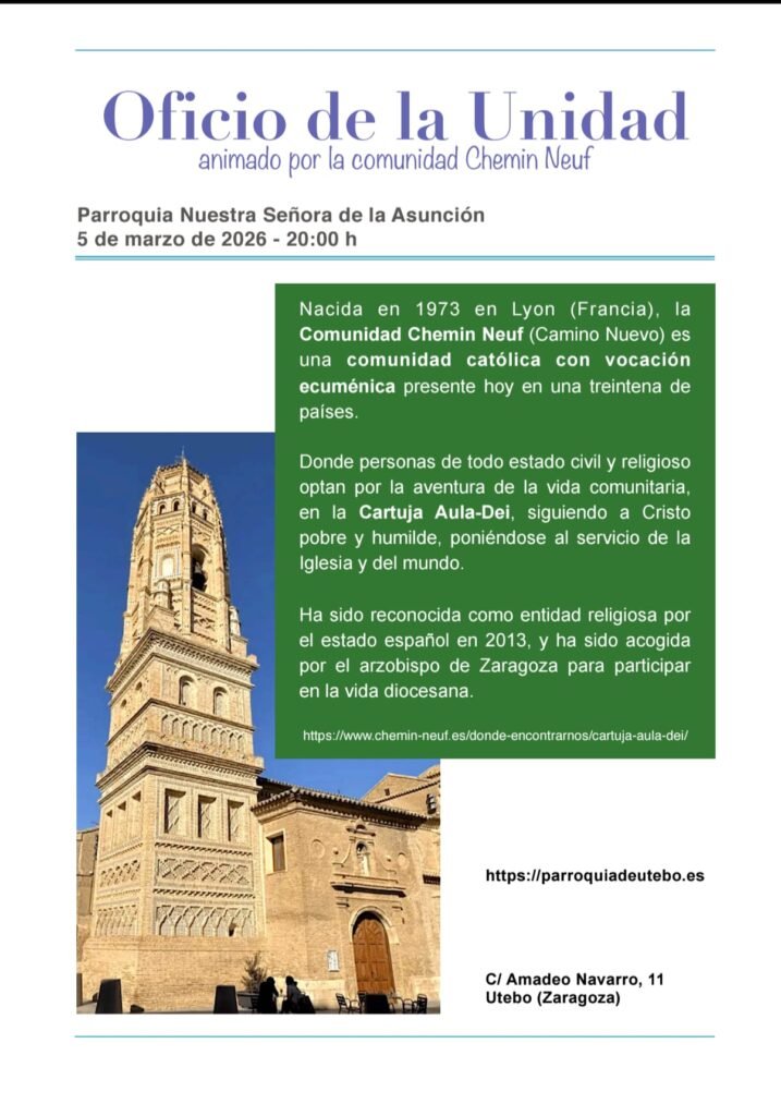 ¡Te damos la bienvenida a nuestra comunidad! En la Parroquia de Utebo buscamos ser un lugar donde todos puedan acercarse a Dios, participar en la vida de la Iglesia y crecer en la fe. Aquí encontrarás información sobre nuestras actividades, horarios de misas, sacramentos y eventos, así como espacios para la oración y la convivencia.